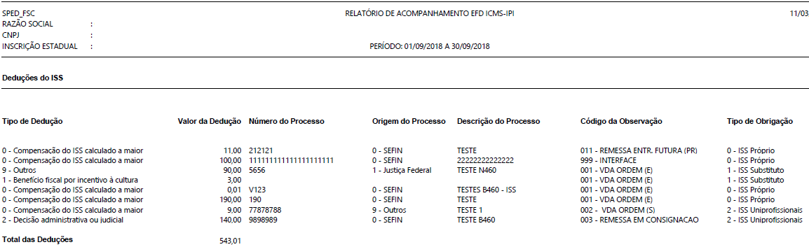 Este quadro corresponde aos valores de deduções do ISS demonstrados no registro B460. É composto pelas colunas: "Tipo de Dedução", "Valor da Dedução", "Número do Processo", "Origem do Processo", "Descrição do Processo", "Código da Observação" e "Tipo de Obrigação".