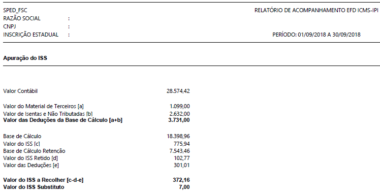 Valor do ISS a Recolher: corresponde a subtração das linhas: Valor do ISS menos Valor do ISS Retido menos Valor das Deduções.