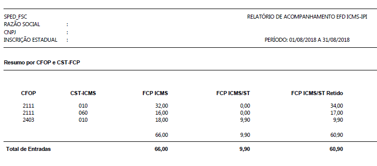 Este quadro corresponde aos valores demonstrados no registro C191, agrupados por CFOP e CST-ICMS, pois as informações apresentadas neste registro são dependentes do registro C190 que possui o agrupamento por CFOP e CST-ICMS. Primeiramente são demonstradas as operações de Entradas e em seguida as operações de Saída. É composto pelas colunas "CFOP", CST-ICMS", "FCP ICMS", "FCP ICMS/ST" e "FCP ICMS/ST Retido".