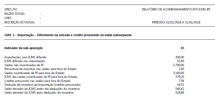 Este quadro corresponde aos valores demonstrados no registro 1975. Serão apresentados abaixo do quadro "GIAF 3 - Importação - Diferimento na entrada e crédito presumido na saída subsequente", que é o registro 1970, pai do registro 1975.