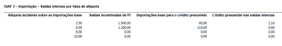 Os valores serão agrupados pela Alíquota incidente sobre as importações-base. É composto pelas colunas: "Alíquota incidente sobre as importações-base", "Saídas incentivadas de PI", Importações-base para o crédito presumido" e "Crédito presumido nas saídas internas".