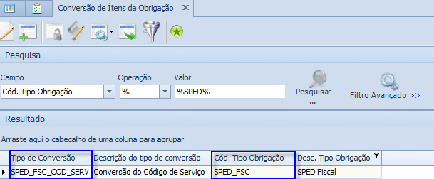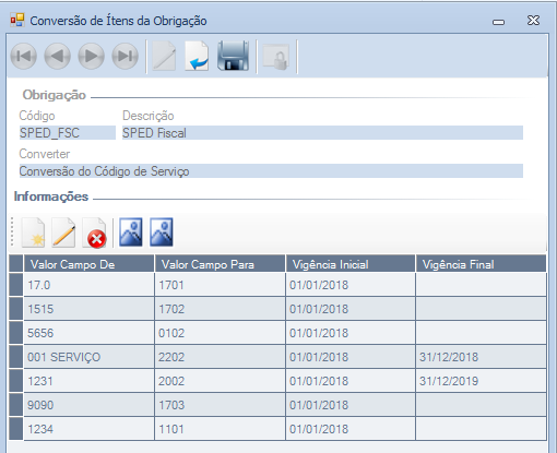 Caso o código do serviço informado em um destes campos não esteja de acordo com a Lei 116/03, ele poderá ser convertido através da tela "Conversão de Itens da Obrigação", conforme detalhado abaixo:
