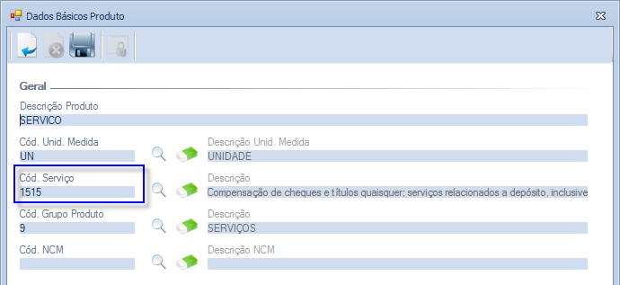 IMPORTANTE: o registro B035 não será gerado quando o campo COD_SERV não for informado. Para apresentar esta informação, será considerado o campo "Cód. Serviço" da aba "Dados Básicos Produto" da tela de Cadastro de Produtos, ilustrado abaixo: