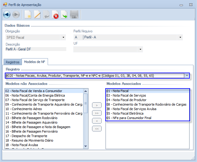 Estes registros serão gerados para as notas fiscais de Serviços Prestados e de Serviços Tomados sujeitas ao ISS, cujo modelo seja igual a: 01, 03, 3B, 04, 08, 55 e 65. Portanto, além de associar os registros ao Perfil de Apresentação, será necessário vincular os referidos modelos aos registros, conforme demonstrado a seguir: