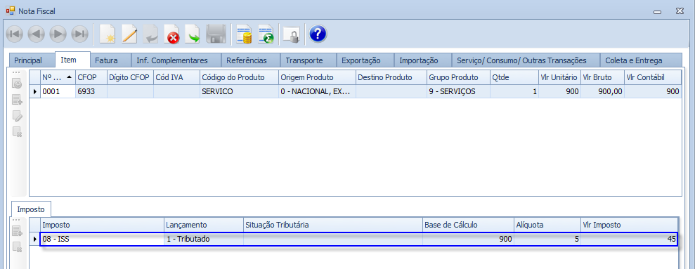 Serão consideradas as Notas Fiscais de Saída de Prestação de Serviço ativas com o imposto 08 (ISS) destacado. Estas Notas Fiscais estão disponíveis na tela de Nota Fiscal.