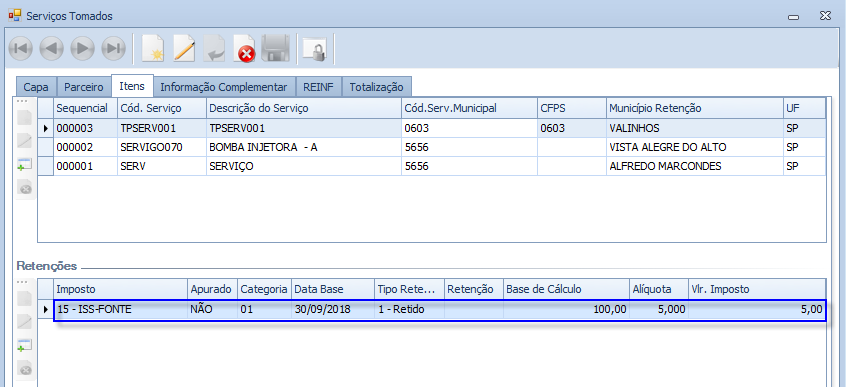 Serão consideradas as Notas Fiscais de Serviços Tomados ativas com o imposto 15 (ISS - Fonte) destacado. Estas Notas Fiscais estão disponíveis na tela de Serviços Tomados.