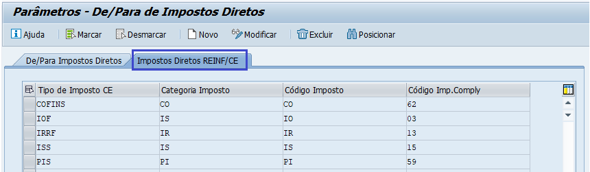 2 - Criada a aba ‘Impostos Diretos Reinf/CE+’ na transação /PWSATI/ZLFM001 (Parâmetros – De/Para de Impostos Diretos) com o de/para dos códigos de impostos CE+ x COMPLY.