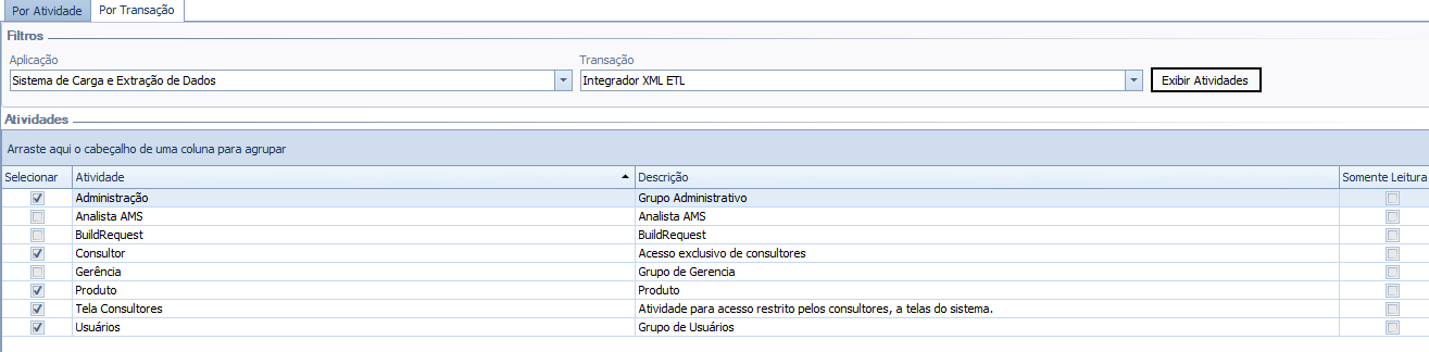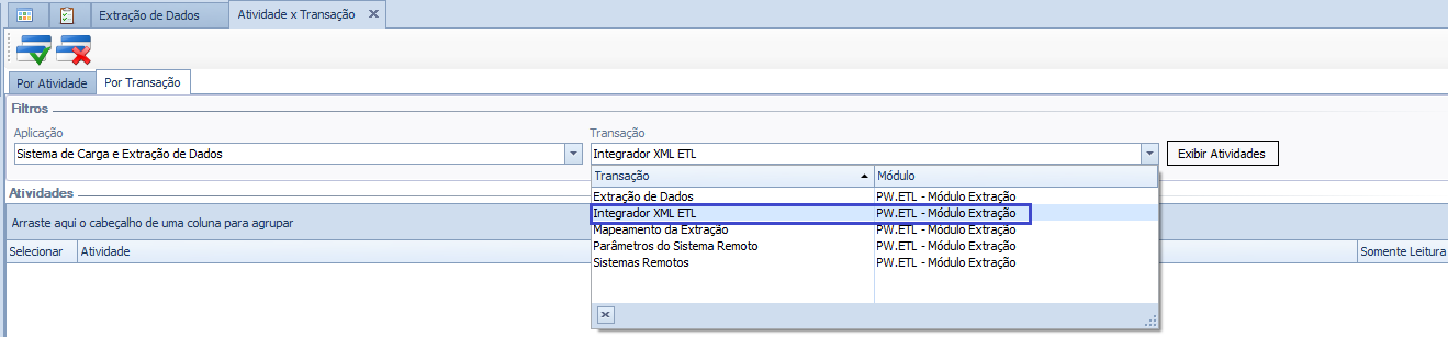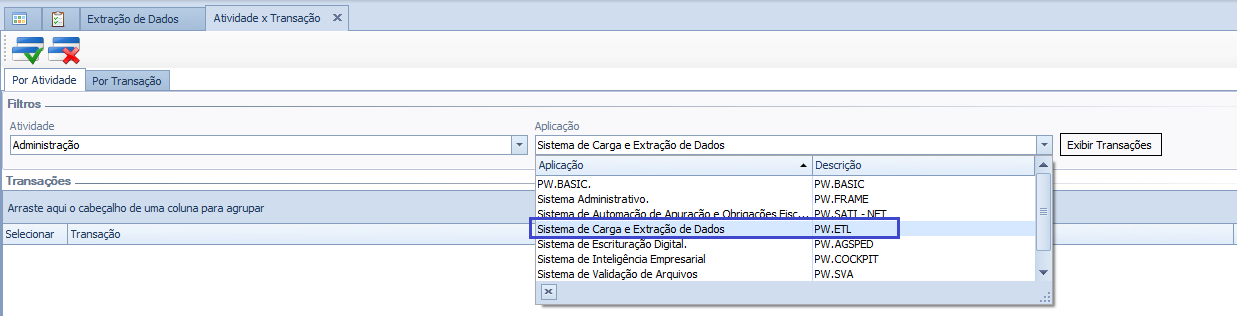 Associar a Transação a Atividade do usuário que ficará responsável pela parametrização dos Cenários e Transformações para o processo de extração.