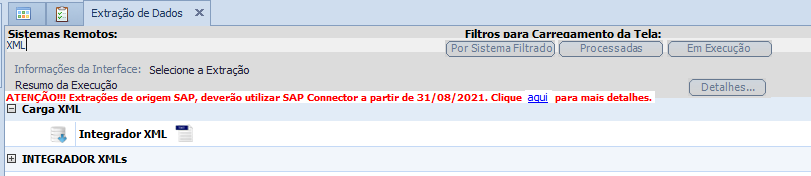 2 - Na tela de "Extrações de Dados" acessar a opção "Integrador XML | ETL" através do botão: "Integrador XML"