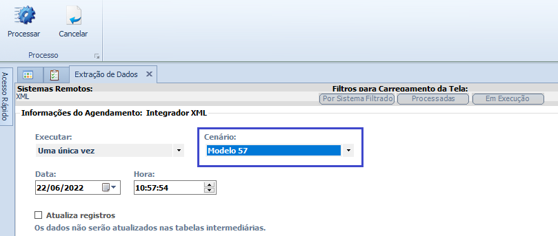 5 - Na tela de "Extrações de Dados", criar as execuções ou agendamentos para a execução do Integrador de XML, para a carga dos dados. Para criar a tarefa deve ser selecionado o Cenário dos documentos a serem carregados: