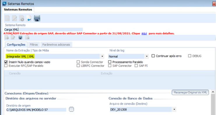 4 - Na Tela de Sistemas remotos devem ser criado(s) o Sistema(s) Remoto(s) e associados a Extração "Integrador XML | XML"