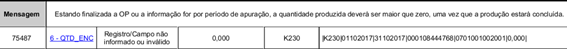 Porém, quando há somente movimentação de insumos e a quantidade de produção acabada é 0 (zero), este campo não pode ser demonstrado, conforme validação do PVA abaixo: