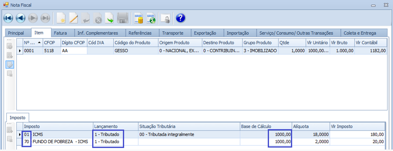 Para somar o imposto principal e FECP, os Tipos de Lançamento e Base de Cálculo de ambos os impostos devem ser iguais.