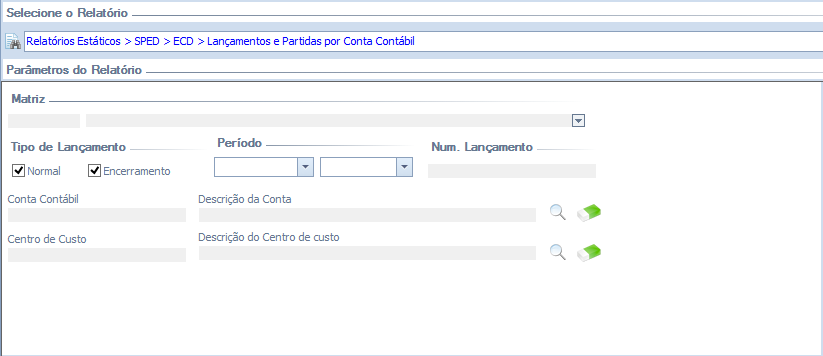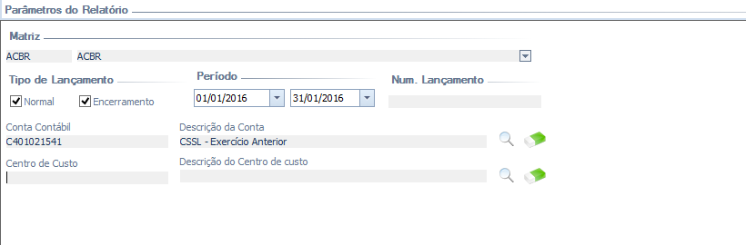 Para gerar o relatório, será necessário informar a Matriz, período desejado e selecionar e/ou informar a conta contábil. Também será possível conferir por número de lançamento ou centro de custo específico.