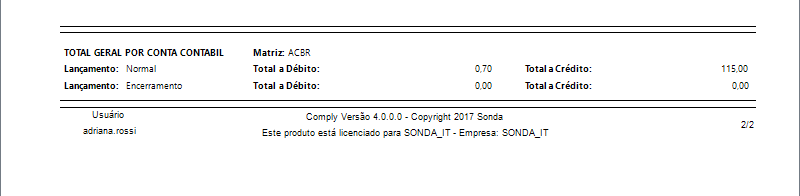 No final do relatório será exibido o total geral por matriz, tipo de lançamento e conta contábil: