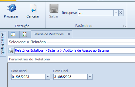 Informar os parâmetros de geração do relatório e clicar em Processar: