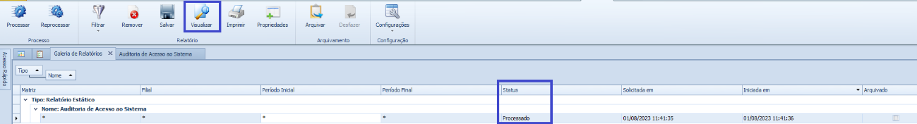 Quando o relatório estiver com Status Processado, selecione a opção Visualizar: