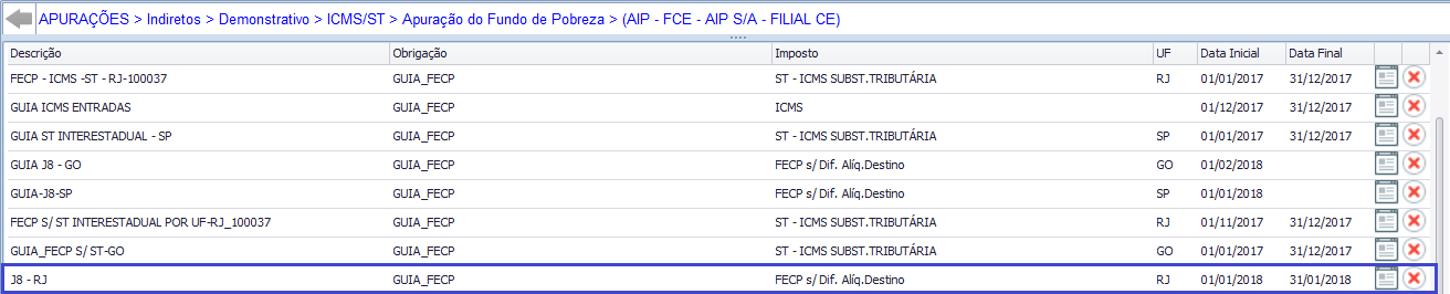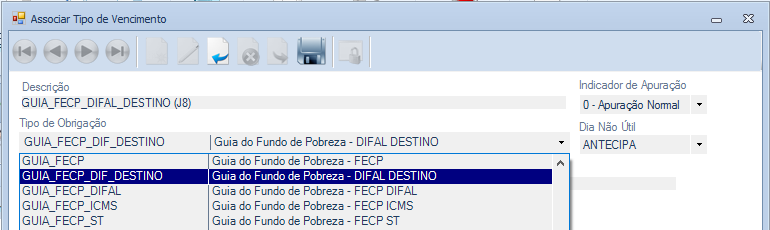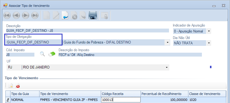 Por ter restado apenas a obrigação GUIA_FECP, não é possível contabilizar as guias do FECP s/ Diferença de Alíquotas - Destino (Imposto J8) separadamente, bem como, se já parametrizadas as guias de acordo com a regra nova, era apresentado uma mensagem de erro, por não permitir a utilização simultânea da obrigação GUIA_FECP juntamente à alguma das novas obrigações disponíveis.