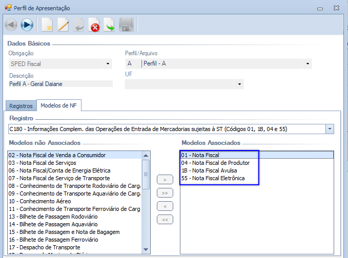 Além disso, é necessário que o Registro e o Modelo da Nota Fiscal estejam associados ao Perfil de Apresentação utilizado na geração do arquivo, conforme demonstrado abaixo: