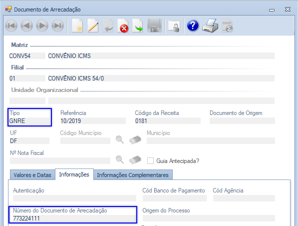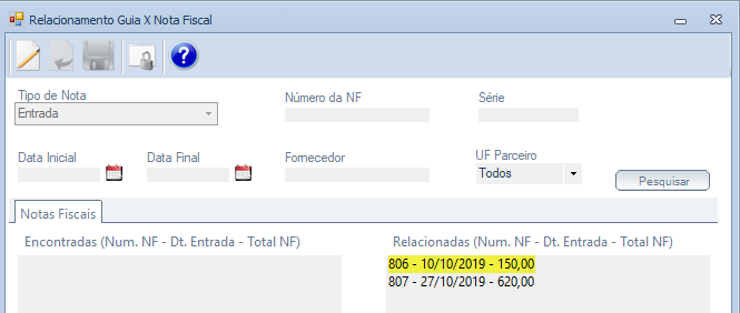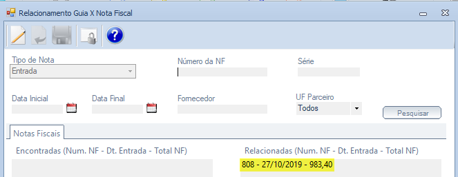 Para apresentação dos campos 10 (COD_DA) e 11 (NUM_DA) é necessário efetuar o relacionamento da Nota Fiscal com a Guia na tela "Relacionamento Guia x Nota Fiscal", conforme demonstrado abaixo: