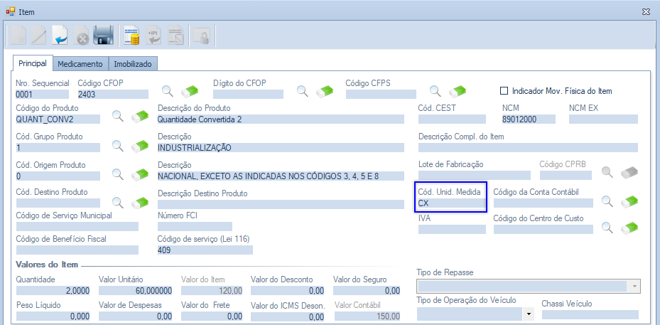 Caso a unidade de medida do item da Nota Fiscal seja diferente da unidade de medida do cadastro de produto, é necessário efetuar a conversão utilizando a tela "Unidade de Medida", conforme exemplo abaixo: