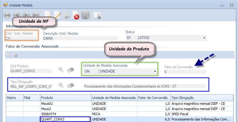 Desta forma, a quantidade da Nota Fiscal será convertida de CX para UN através da multiplicação da quantidade da Nota Fiscal pelo Fator de Conversão estabelecido nesta tela.