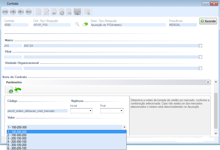 Este Parâmetro exibirá seis combinações, caso não exista um dos mercados selecionados o mesmo será desconsiderado na Apuração PIS/COFINS.
