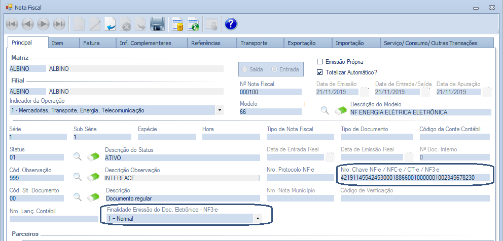Tratamentos na tela de Notas Fiscais, em atendimento ao ATO COTEPE 24/2019 e ao Guia Prático 3.0.2 da EFD ICMS/IPI, para Nota Fiscal de Entrada de Energia Elétrica Eletrônica - modelo 66: