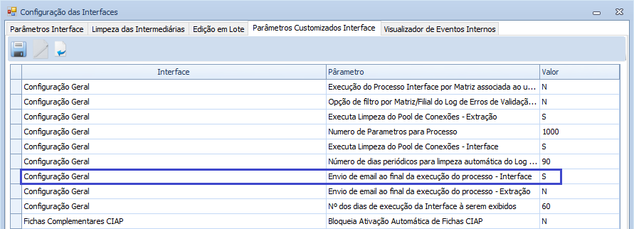 Ajuste dessa entrega de envio de e-mail ao final da execução dos processos de Interface, foi passar o valor default para "N" (não enviar o e-mail), portanto após a aplicação o parâmetro ficará “N”, igualmente a imagem abaixo, e assim ficando uma configuração opcional aos clientes à ativação do envio o e-mail ou não.