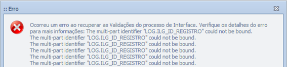 Ao finalizar o processo de interface e sendo necessário verificar os erros através da opção Validações de Processo, a tela não estava abrindo e ocorria o erro abaixo: