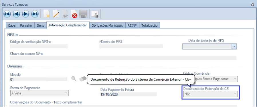 O novo campo Documento de Retenção do CE está disponível na aba de Informação Complementar, com o esclarecimento de que é um Documento de Retenção do Sistema de Comércio Exterior - CE+