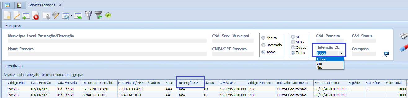 O novo campo de Retenção CE está disponível para ser pesquisado, com as seguintes opções: