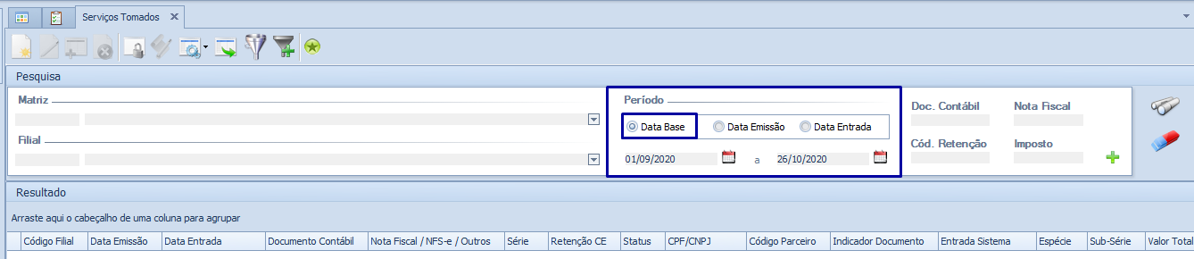 Melhoria efetuada para apresentar a Data Base como opção padrão do sistema, pois é a data considerada para as Apurações dos Retidos, para as Obrigações Municipais e Federais.