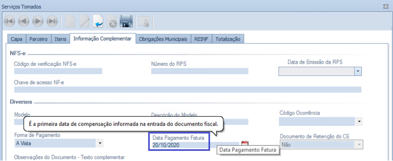 A alteração do nome e a transferência para a aba de Informação Complementar visa facilitar o entendimento de que é a primeira data de vencimento informada na entrada do Documento.