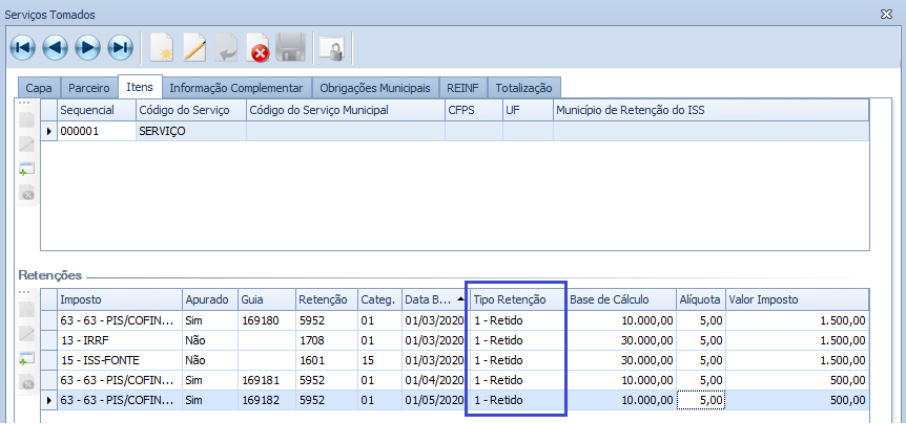 As colunas Imposto Retido, Imposto Não Retido e Imposto Isento consideram o Tipo de Retenção do Imposto, que podem ser: