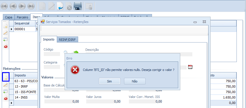 O erro ocorria na opção de edição, quando solicitado a inclusão de novo Imposto.