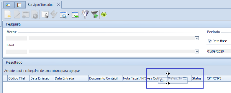 No exemplo abaixo a coluna Série ficará posicionada entre as colunas de Nota Fiscal e a coluna Retenção CE.