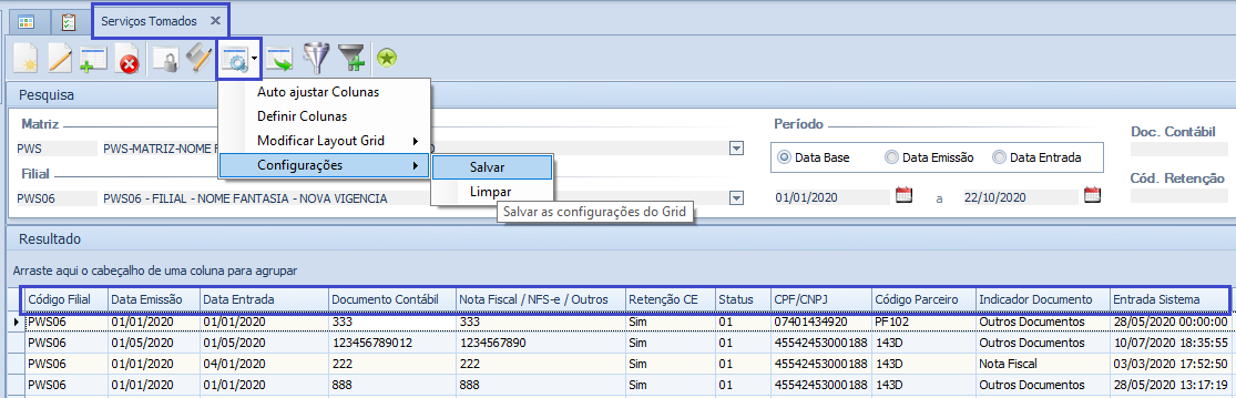Após alinhamentos de todas as colunas é necessário Salvar as alterações clicando no botão de Configurações do Grid e Configurações.