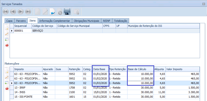 Os parcelamentos podem ser visualizados na tela de Serviços Tomados, na aba de Itens, em Retenções, na coluna Data Base.