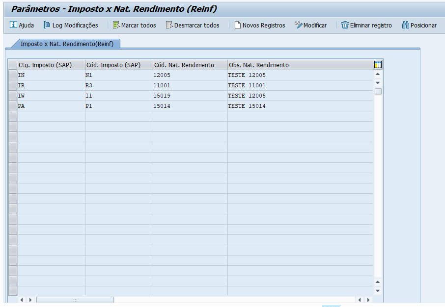 Dessa forma, para os documentos identificados, será levada a informação, encontrada no campo “Nat. Rendimento” deste parâmetro, para o campo “IIT_NAT_REND - Código Natureza de Rendimento”, presente na tabela “/PWSATI/ZSATI101 - Serv. Tomados Item”.