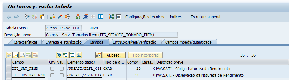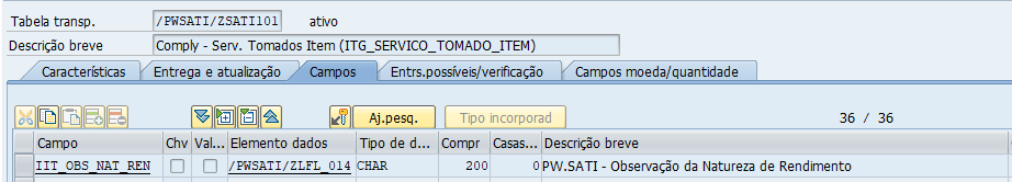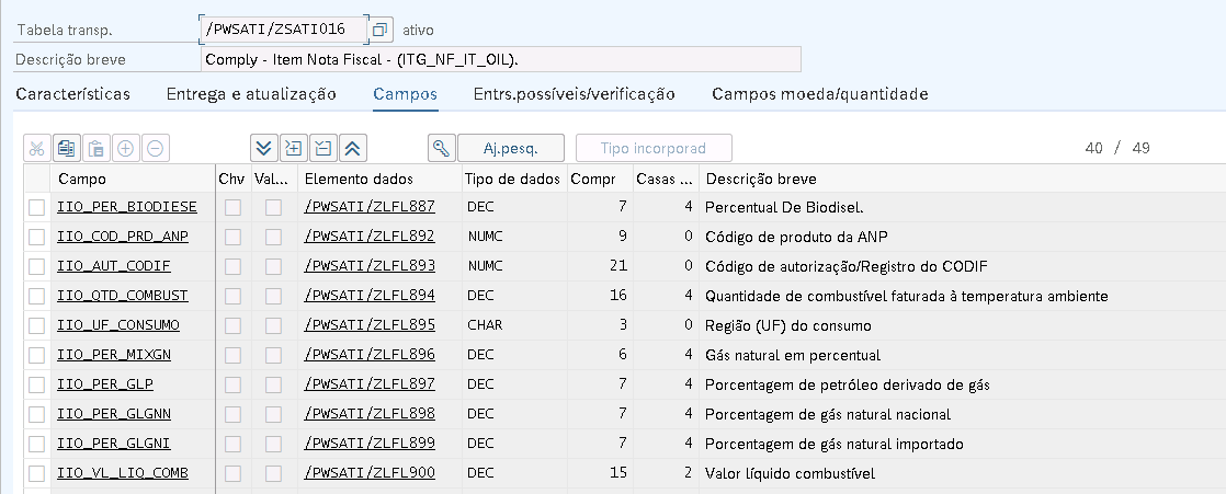 b) Criação de novos campos na tabela: /PWSATI/ZSATI016 Comply – Item Oil (ITG_NF_IT_OIL)