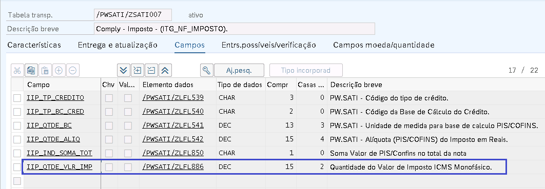 a) Criação de novo campo: IIP_QTDE_VLR_IMP na tabela: /PWSATI/ZSATI007 Comply - Item - (ITG_NF_ITEM)