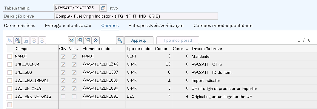 c) Criação de nova tabela: /PWSATI/ZSATI025 Comply – Item Indicador Origem (ITG_NF_IT_IND_ORIG)