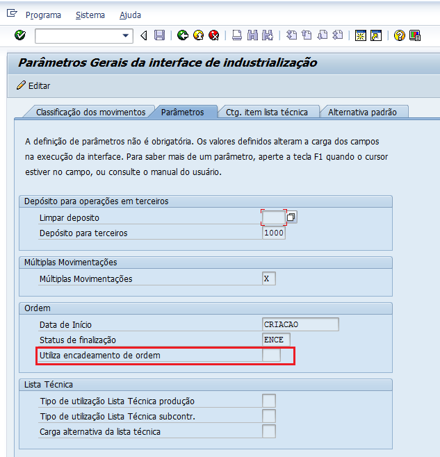 Para maiores detalhes sobre a parametrização desta transação, consulte as Notas (008571 PW.SATI ou 008587 Comply).