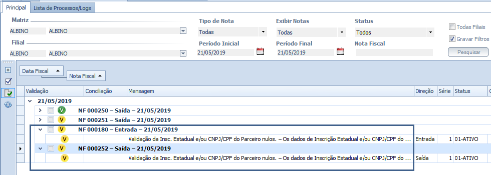 As validações também são apresentadas na tela Validação e Conciliação Fiscal.