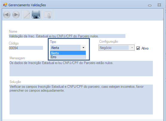 Caso queira, que esta validação seja apresentada como Erro tanto na tela de Notas Fiscais como na tela Validação e Conciliação Fiscal, alterar o campo Tipo na tela Gerenciamento de Validações, conforme destaque abaixo.