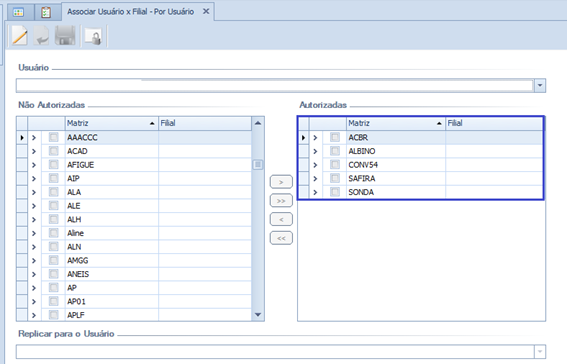 Exemplo de duas telas mencionadas acima, habilitando somente as matrizes que foram configuradas no perfil.