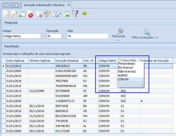 Descrição da Nota: Melhoria para quando for efetuar pesquisa ou inclusão nas telas: Centralizar Dados, Unidade Organizacional, Inscrição Substituição Tributária, Transferência de Estabelecimento, Inscrição Estadual Virtual, Produto, Alíquota ICMS por Produto, Conversão de Códigos de Produtos, Conversão de Unidade de Medida, Movimento de Estoque, Ordem de Produção, Local de Estoque, Parceiro, Lista Técnica, Configurar Parâmetros e Valores Agregados Por Município.