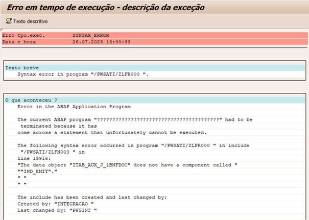 Ao solicitar a extração de Notas Fiscais Indiretos por meio do extrator /PWSATI/ZLFR000 após a atualização para o Pacote Base 22, estava ocorrendo o seguinte erro em ambientes cujo SAP tenha a versão 4.6: