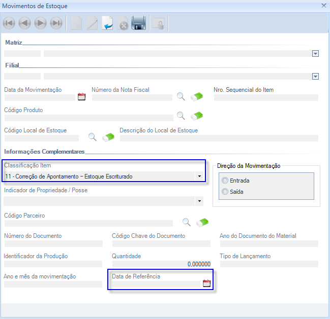 Atenção: este campo será habilitado somente quando selecionar as opções 10 (Correção de Apontamento – Produção e Movimentações Internas) ou 11 (Correção de Apontamento – Estoque Escriturado) do campo "Classificação Item".